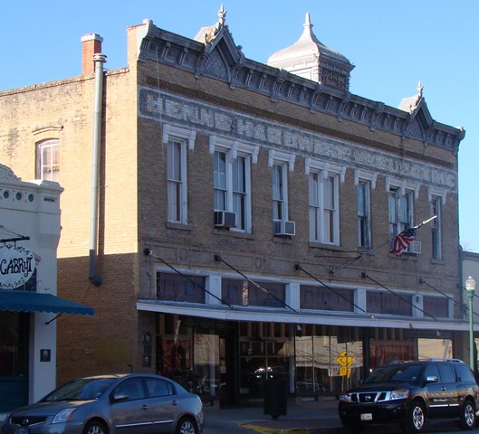 Victorian embellishments distinguish this structure, built 1893 by noted local contractor Christian Herry. Owner Louis Henne (1840 -1912) worked in the family tin shop next door, expanded to this site. Third generation now conducts this business. Recorded Texas Historic Landmark - 1973 |